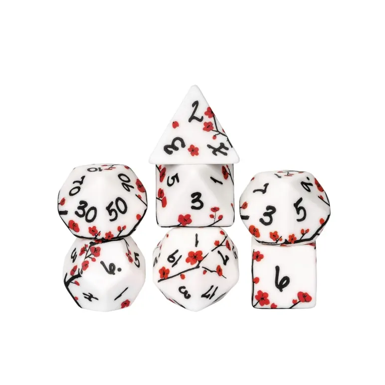 Dette sæt indeholder 7 terninger. Massiv hvid med print med røde kirsebærblomster. Kommer i en papæske med vindue.