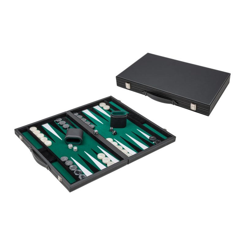 Lækker Backgammon kuffert i imiteret læder med grøn filt, påtrykte sorte og hvide felter og sorte og hvide marmorerede brikker og terninger