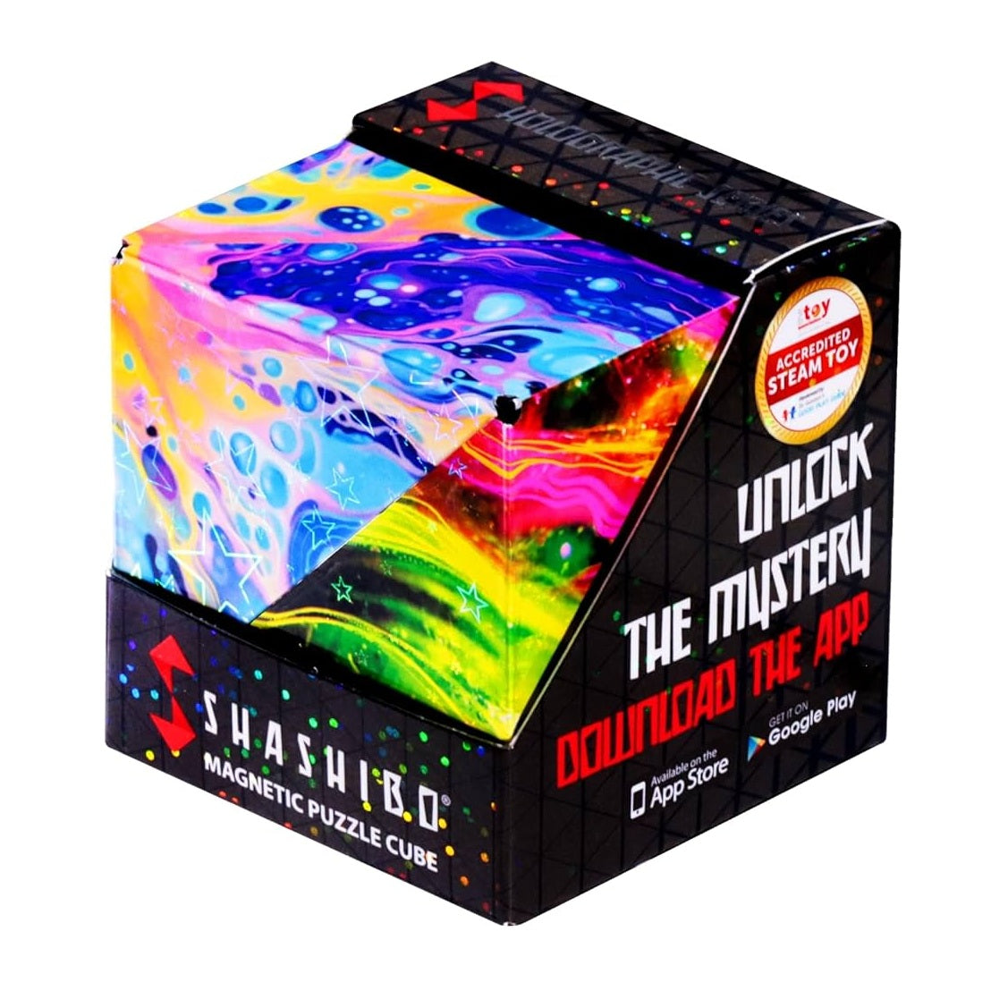 Opdag den prisvindende, STEAM-akkrediterede Shashibo magnetiske puslespilsterning, der forvandles til over 70 geometriske former. Perfekt til at øge kreativiteten, slappe af og nyde teknologifri sjov – velegnet til fans i alle aldre! Magnetisk. Har holografiske stjerner på siderne.