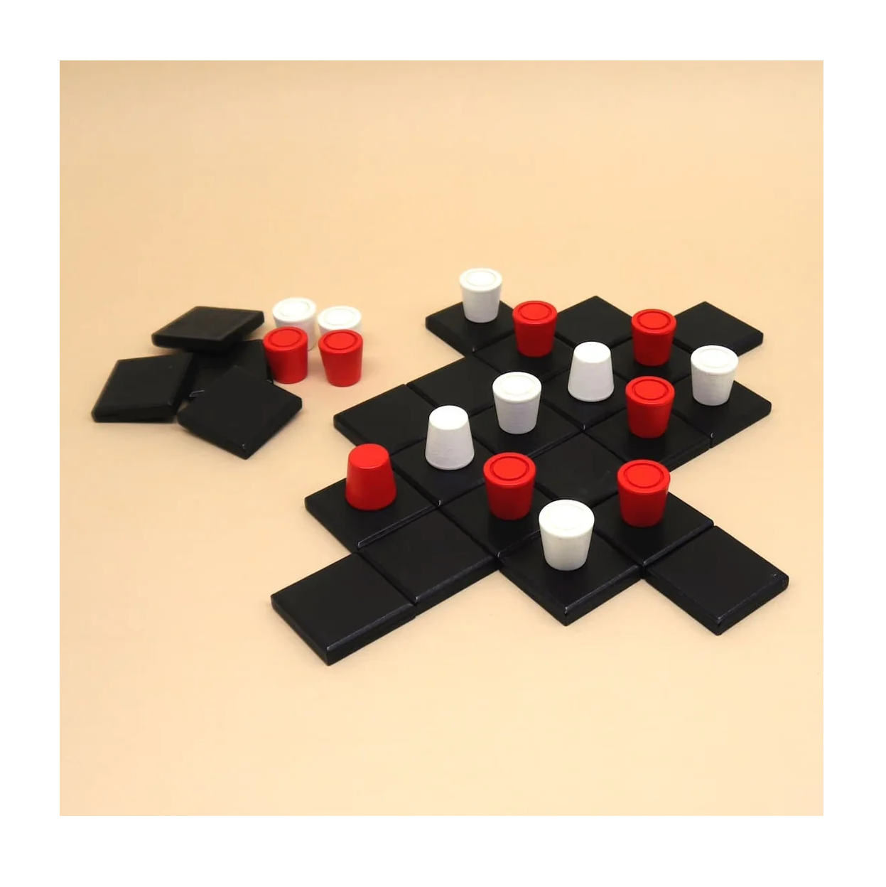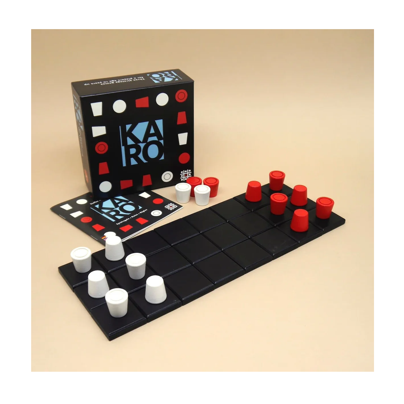 Karo indeholder 24 sorte træbrikker og 16 spillerbrikker med unikke markeringer på hver side (8 røde - 8 hvide).