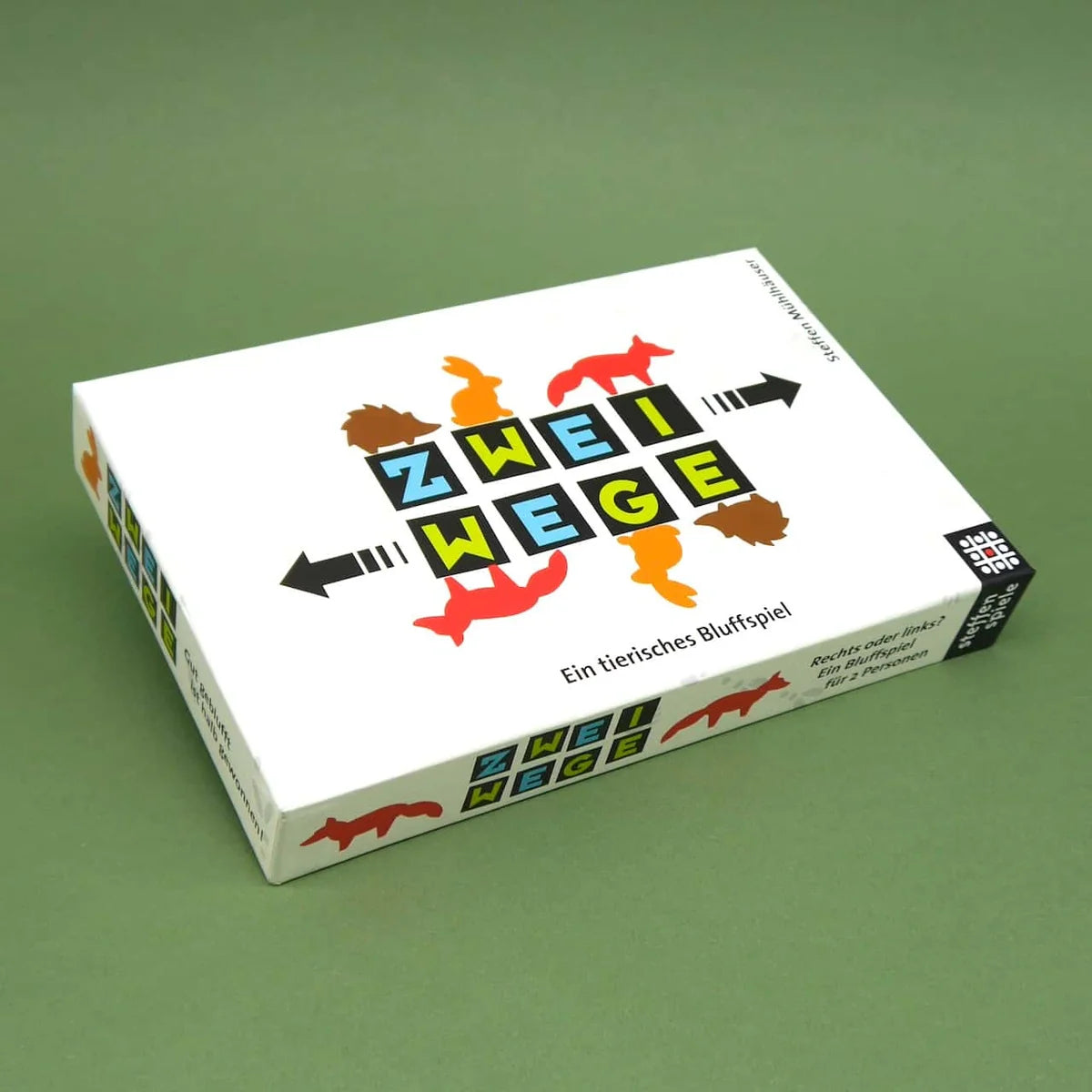 Zwei Wege er et perfekt bluffspil. Spillernes opgave er at få deres tre dyr over på den anden side af spillebanen. Figurerne har ét motiv: at skjule deres planlagte rute. Chancerne for at komme foran er 50:50. Fordi der fra hver position er præcis to mulige veje til den næste destination, og modstanderen må kun blokere én vej.
