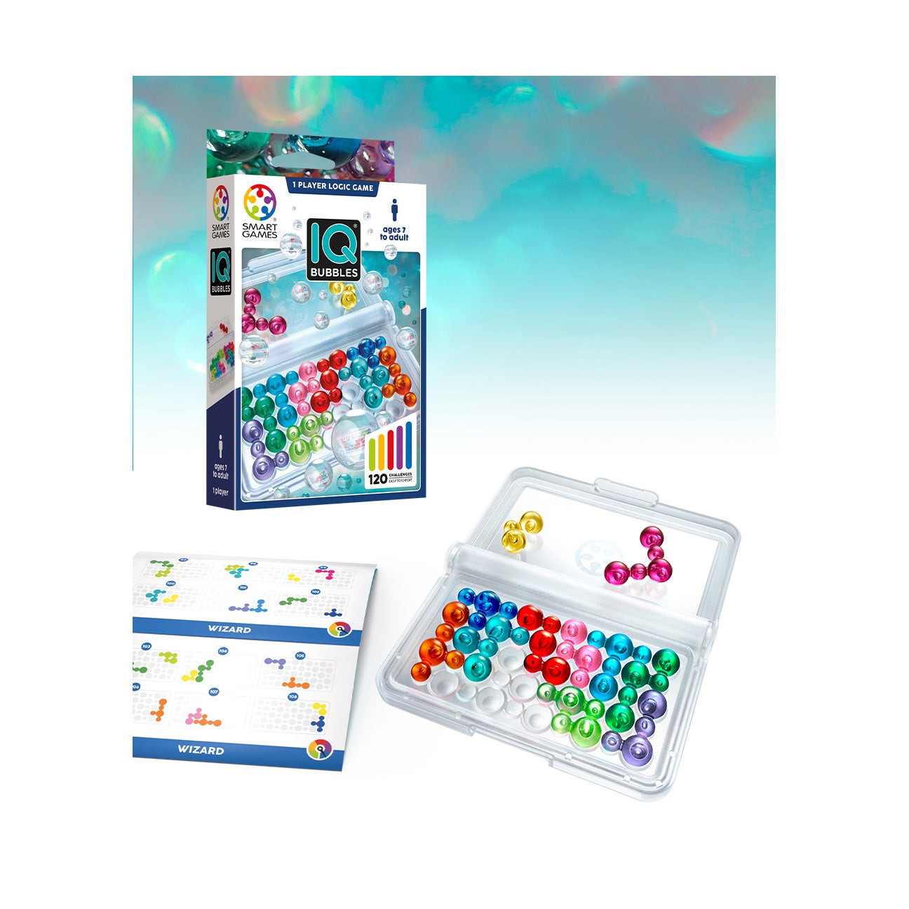 Test din hjernekapacitet med IQ Bubbles! Dette vanedannende puslespil udfordrer spillerne til at få alle de farverige, gennemsigtige boblebrikker til at passe ind på det rejsevenlige spillebræt/kasse.