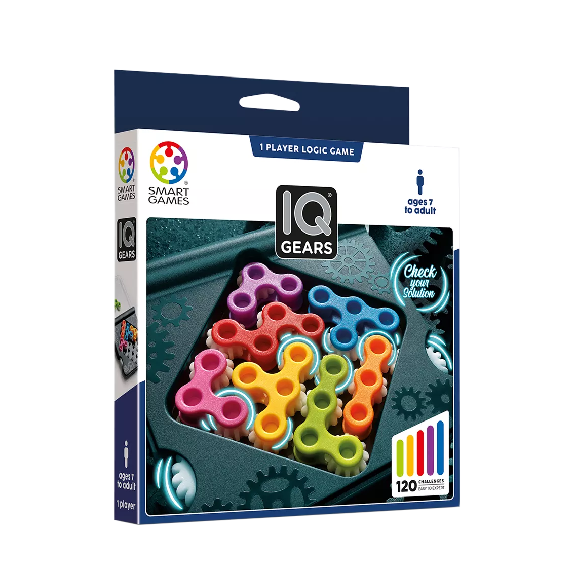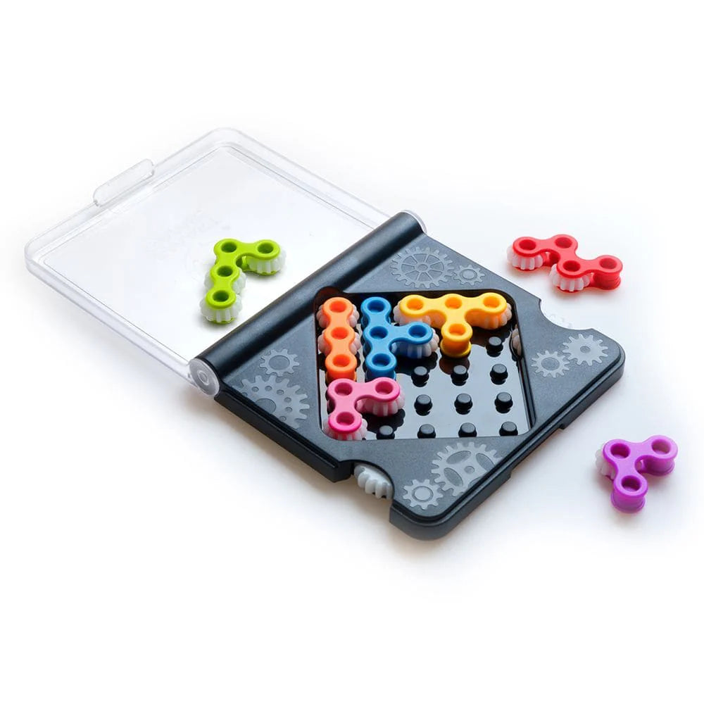 Et IQ-spil, der vil sætte din hjerne i højt gear! Kan du få alle gearene på spillebrættet? Når du har den rigtige løsning, vil brikkerne forbindes ... og de store hjul på siderne af spillebrættet vil dreje sammen! Er rejsevenlig med låg.