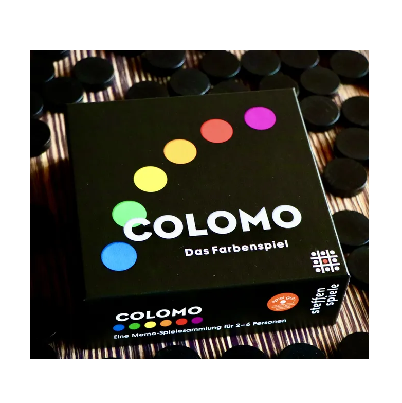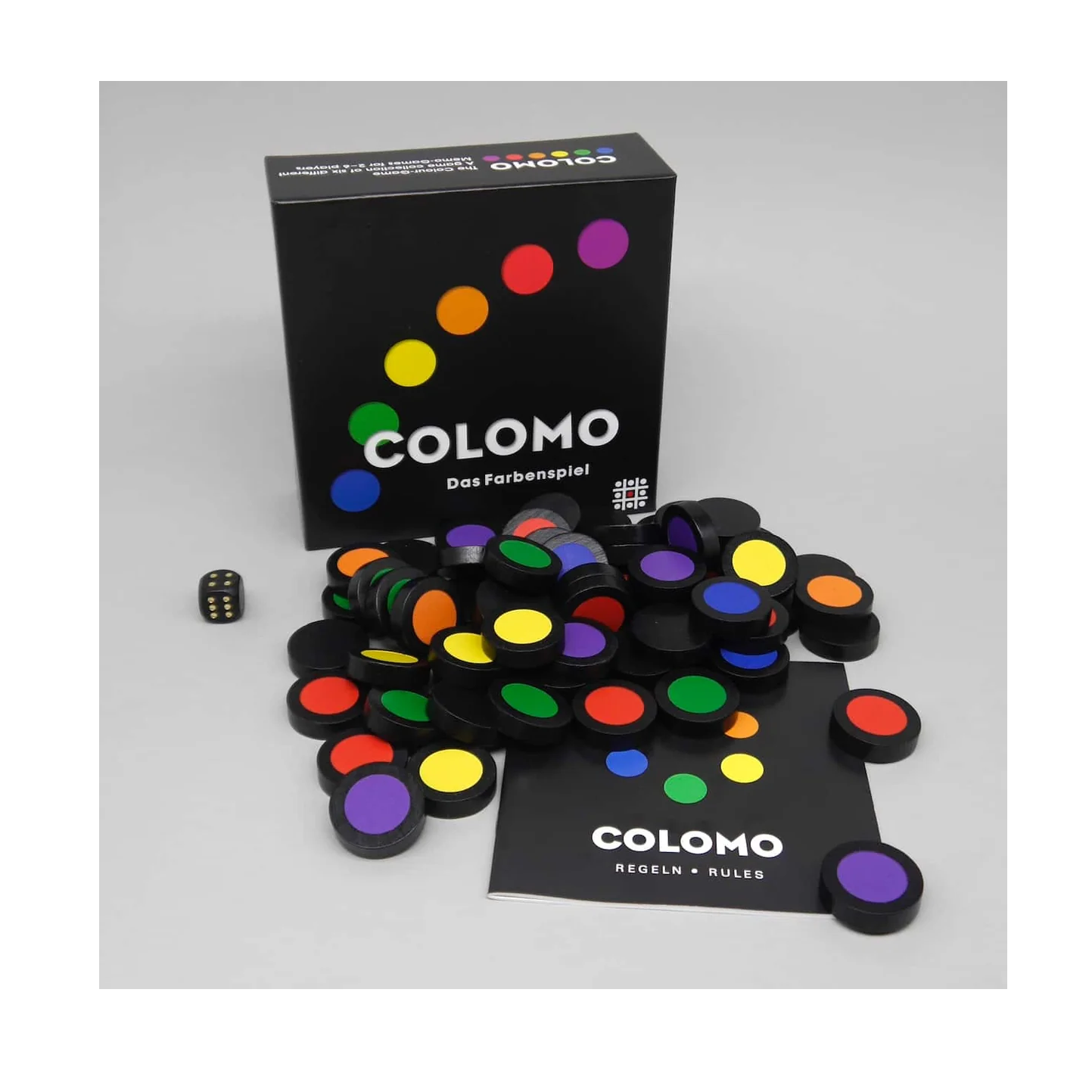 Colomo leveres i en lille æske, der indeholder 60 træcylindre i 6 forskellige farver (regnbuens farver) og en terning.