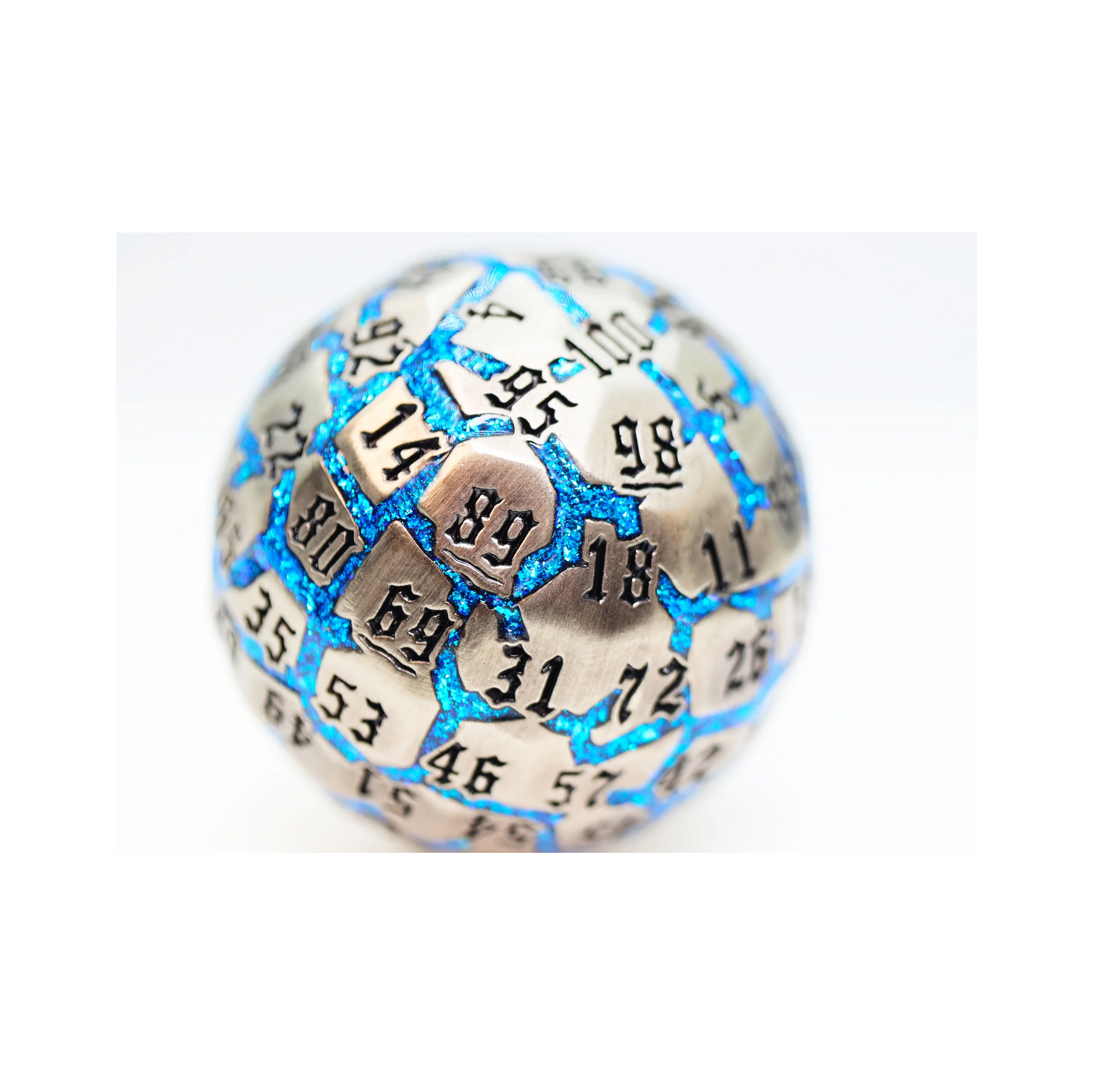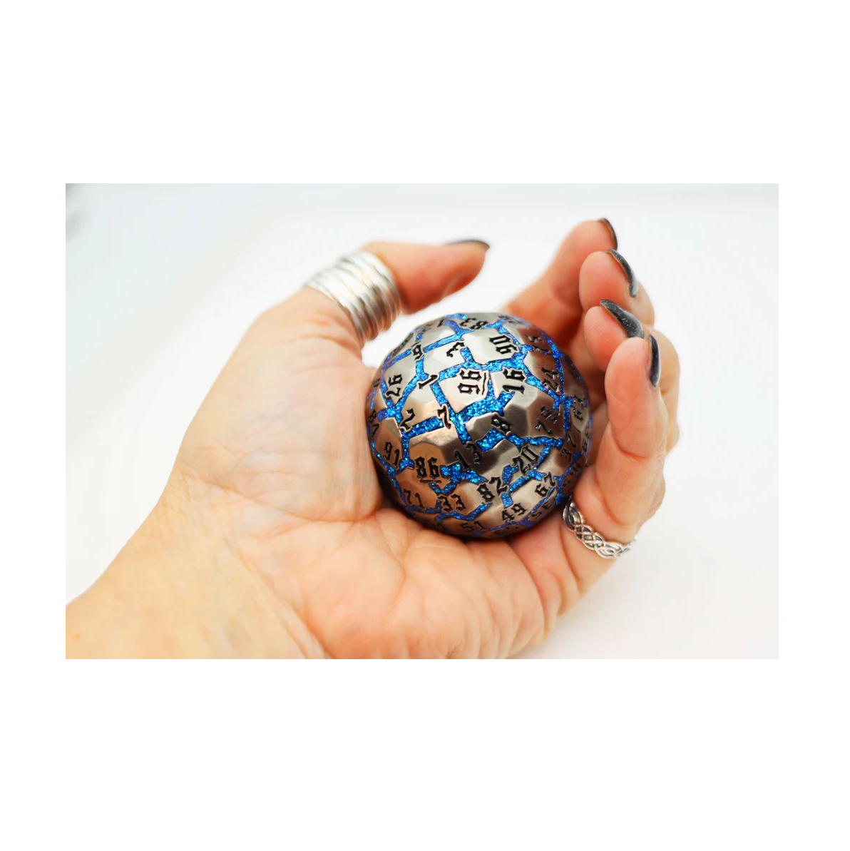 Stor 100 siders terning på 5 cm i diameter, tung metal med blå glimmer i sprækkerne.