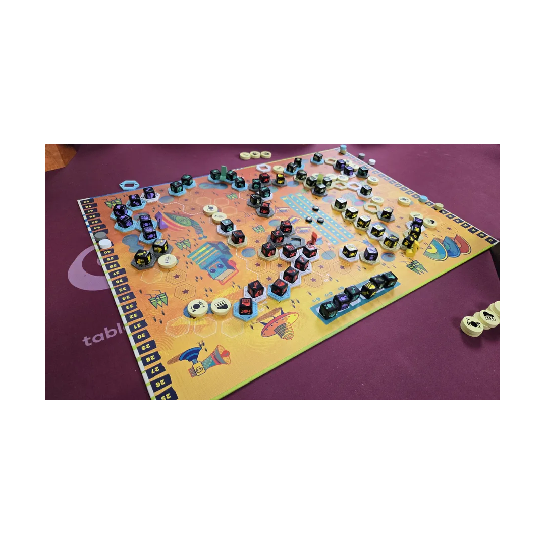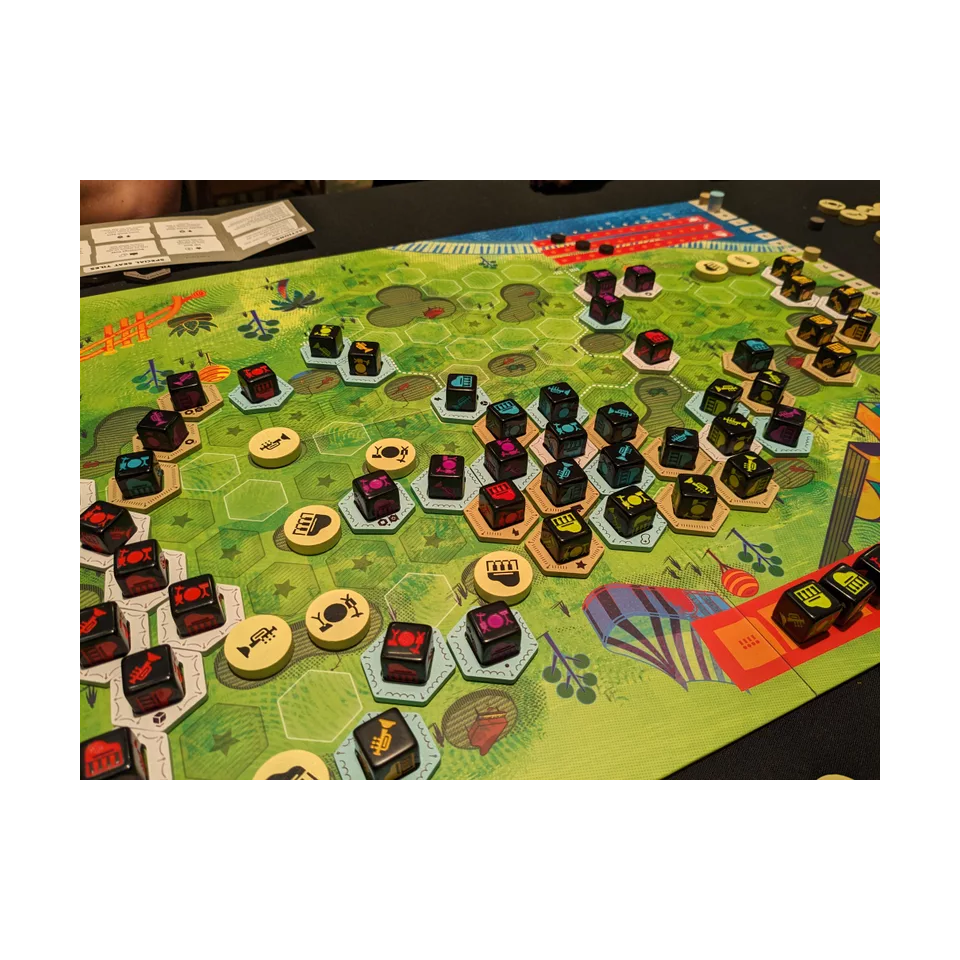 - Konkurrer om at gøre krav på spillebrikker og byg de største terningfamilier, mens du udløser sceneoptrædener på det rigtige tidspunkt.