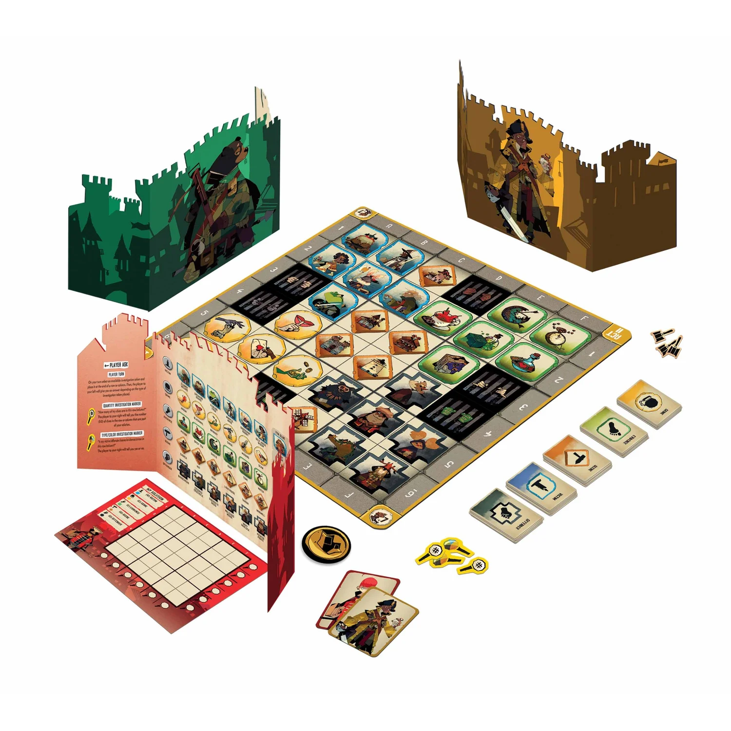 Hvert scenarie kommer som et 6x6 gitter, hvor du kan finde forskellige typer farvede bokse. Hver boks farve svarer til en type bevis, og i starten af spillet trækker hver spiller et kort for hver type bevis på gitteret. Denne kombination af kort er din nabos løsning, så hver spiller er ansvarlig for en anden spillers løsning. Tur efter tur stiller hver spiller udvalgte spørgsmål, der ikke kun vil hjælpe dem selv, men også alle andre, der spiller. Målet er at finde ud af din løsning, før du løber tør for spørgsmål, da du kun har et begrænset antal spørgsmål at stille, før scenariet slutter!